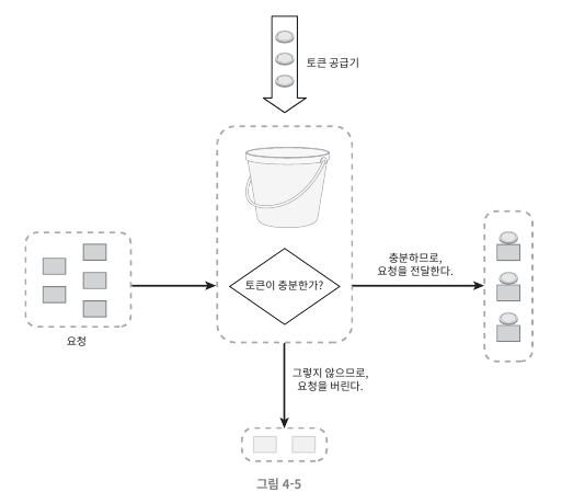 - 요청이 들어오면 먼저 충분한 토큰이 있는지 검사한 후, 있는 경우 버킷에서 토큰 하나를 꺼낸 후 요청을 시스템에게 전달한다.